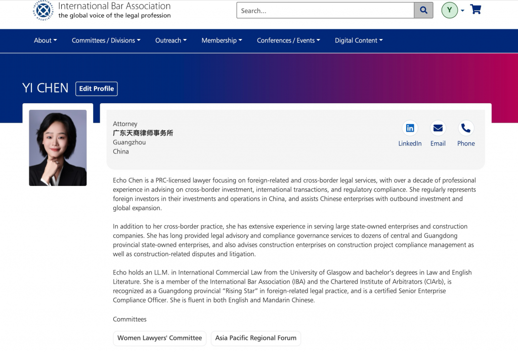 Lawyer Echo Chen has officially become an individual member of the International Bar Association (IBA) and has joined both its Asia Pacific Regional Forum and Women Lawyers’ Committee, actively participating in professional dialogue on Asia-Pacific legal affairs and international legal practice.
