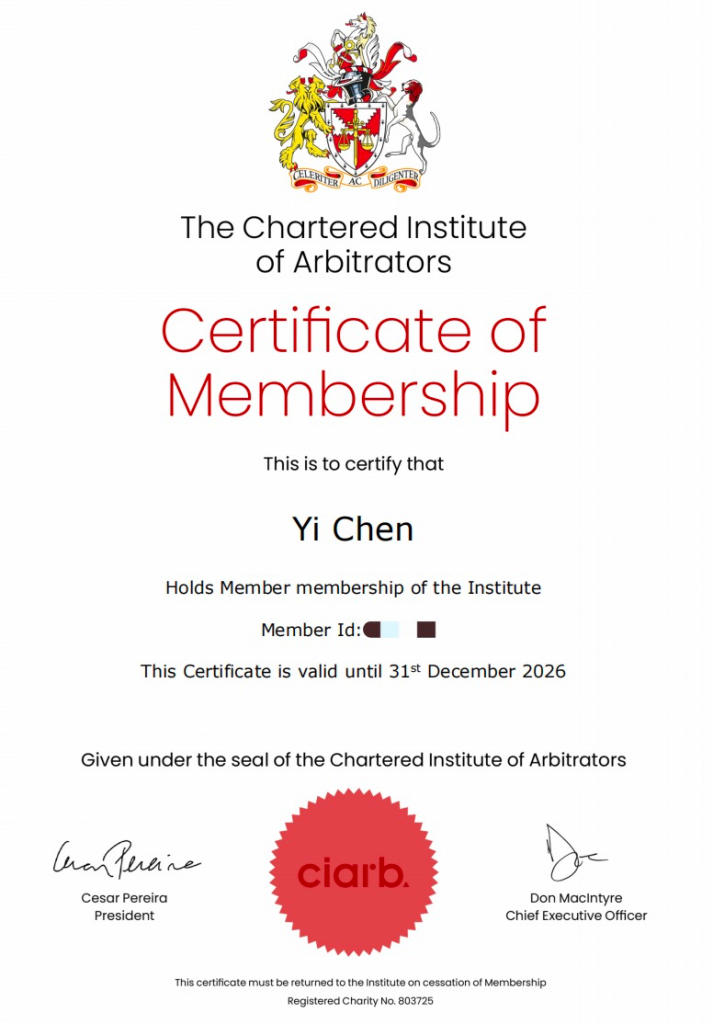 As an internationally recognized professional body for the qualification of arbitrators, CIArb enjoys outstanding authority in the field of training, education, and research in arbitration and alternative dispute resolution. Its membership structure follows a three-tier progression system: Associate → Member → Fellow. The MCIArb status obtained by Ms. Chen represents an intermediate professional membership, demonstrating her solid command of international arbitration rules, practice, and legal application, as well as her professional qualification to participate in complex cross-border dispute resolution matters.