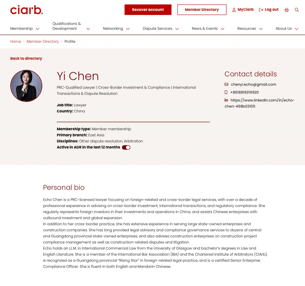 As an internationally recognized professional body for the qualification of arbitrators, CIArb enjoys outstanding authority in the field of training, education, and research in arbitration and alternative dispute resolution. Its membership structure follows a three-tier progression system: Associate → Member → Fellow. The MCIArb status obtained by Ms. Chen represents an intermediate professional membership, demonstrating her solid command of international arbitration rules, practice, and legal application, as well as her professional qualification to participate in complex cross-border dispute resolution matters.